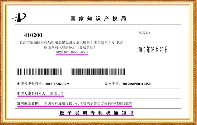2018年10月,湖南大学机械学院金湘中教授委托欧诺对其技术交底书“金属材料深熔焊接小孔形貌和等离子体全方位观测装置”进行专利挖掘和布局。欧诺的专利代理师在认真研究该课题技术以及跟金教授团队做出充分沟通后,对该技术建议申请5件发明专利。随后,在申请日后的9个月内,这5件发明专利全部顺利取得授权。
