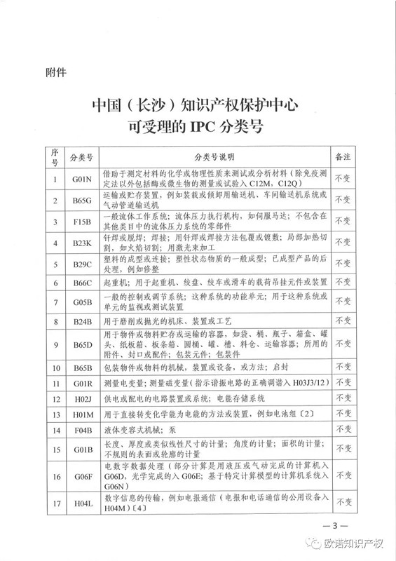 导读:为了进一步满足长沙企事业单位对快速预审受理范围的需求,中国(长沙)知识产权保护中心结合2018年接受预审案件的分类情况、备案企业需求调研以及长沙地区专利申请整体情况分析,经国家知识产权局审核批准,将IPC分类号的受理范围调整为48个,其中部分分类号进行了替换,外观设计分类号受理范围保持不变。