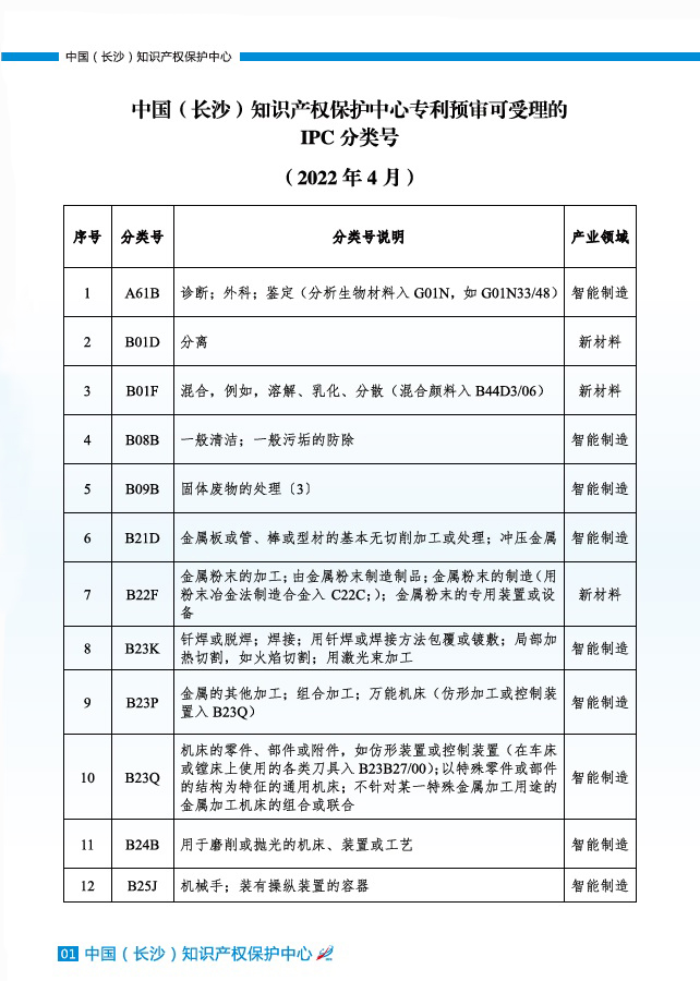 4月22日,长沙知识产权保护中心对外发布面向新一代信息技术领域开放专利预审服务的消息。截至目前,长沙保护中心专利预审绿色通道覆盖智能制造、新材料、新一代信息技术三大产业领域,可受理的IPC分类号由48个增至83个。